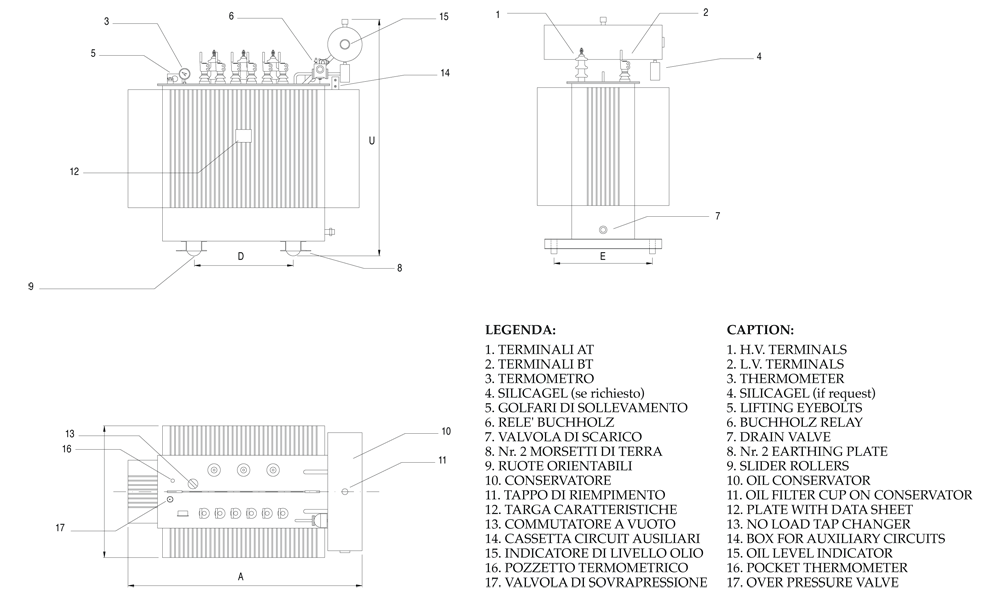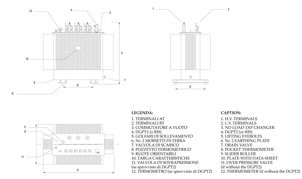 Standard Norms CEI14-4, IEC 76. Power range from 25 up to 30.000 kVA. Insulation Class from 12 up to 170 kV